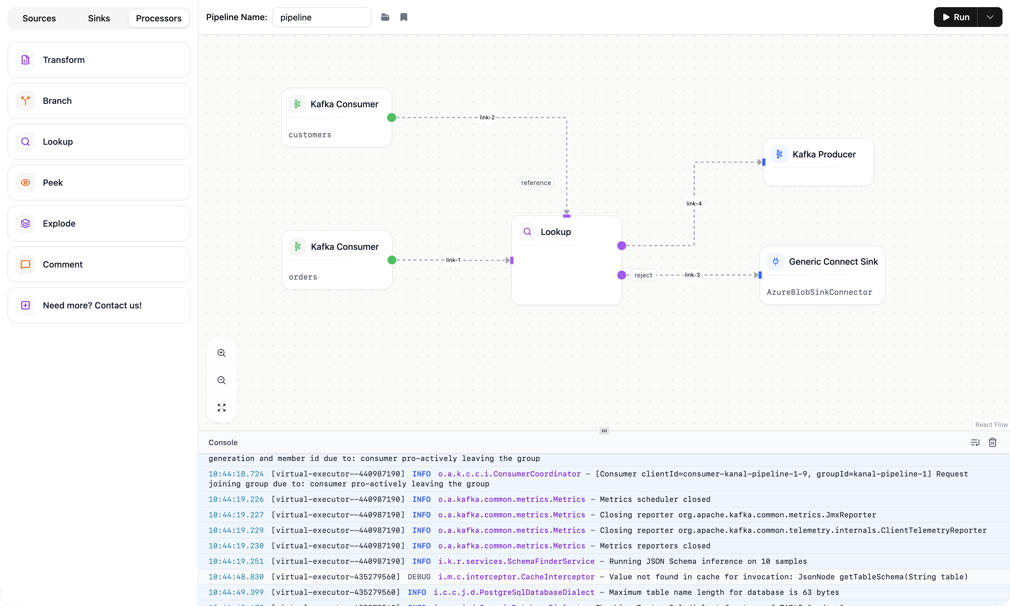 Drag, drop, connect. Stream/table joins, transformations with JSONata, auto-complete guiding you through.